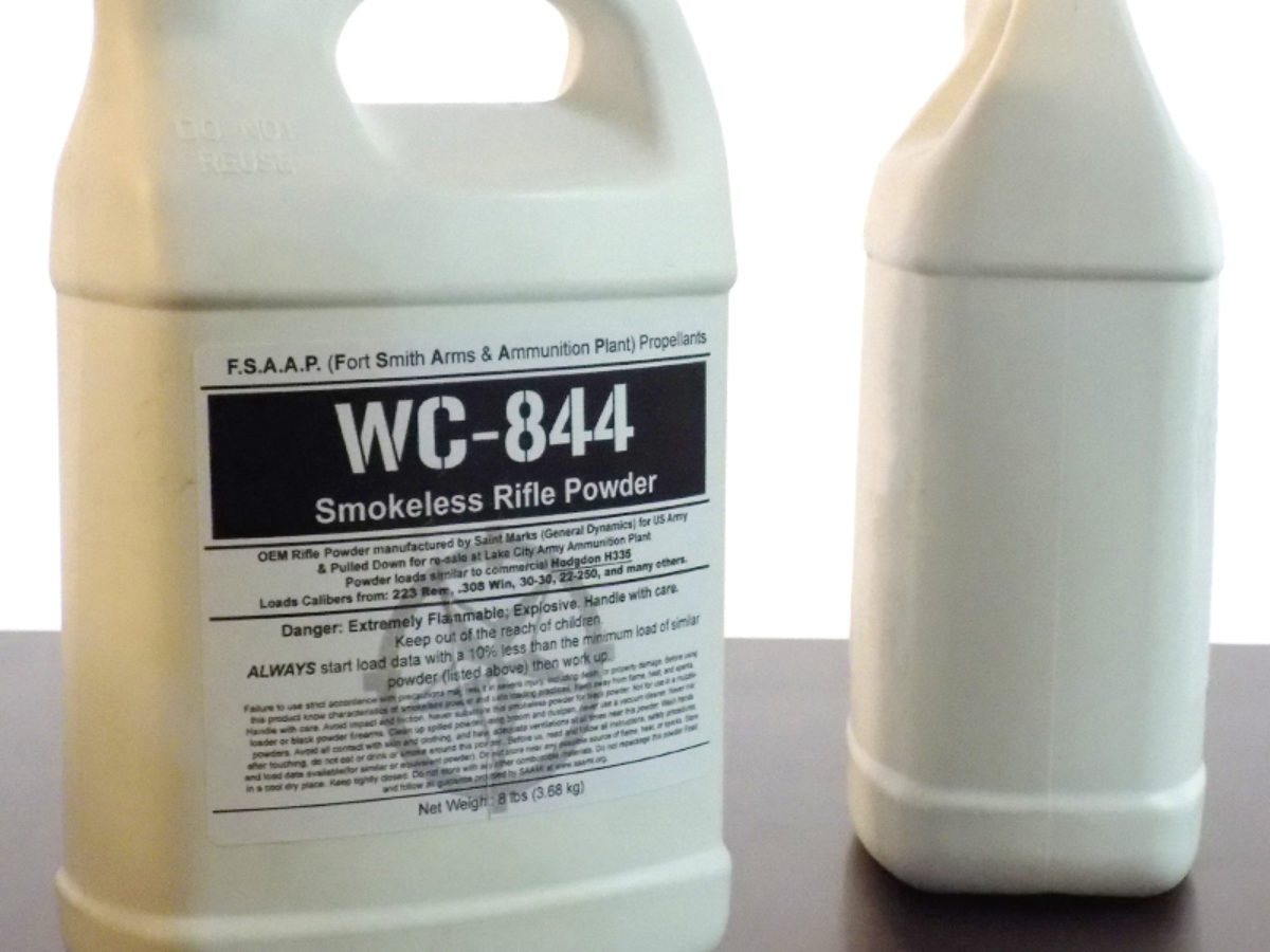 16 lbs of WC-844 smokeless double-base rifle powder packaged in two 8 lb UN 4G Rated Hazmat Jugs within a re-usable shipper kit. The jugs as shown are fully individually labeled for easy re-sale on store shelves. This military grade smokeless powder is a ball-style powder manufactured by Saint Marks (General Dynamics) for the US Army. It was pulled down in 2018 for the Fort Smith Arms and Ammunition Plant (FSAAP) at Lake City Army Ammunition Plant by certified Lake City & ATK Engineers. It has been certified for re-use, pressure, burn rate, accuracy, and unique lot numbers by both entities under ISO:9001 standards before packaging for re-sale.